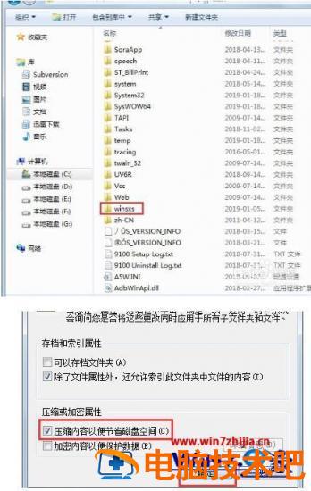 7、然后,在C盘下的Windows里,找到winses,然后右击,出现属性,再单击一下,这时,我们在出现的窗口中,找到“压缩内容以便节省磁盘空间”,将前面方框用鼠标单击一下,打上勾就好啦。这样,C盘的空间就会节省下来很多,电脑运行速度就会大大加快了。