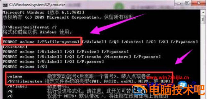 3,键入命令 format /? 可以查找format相关的参数。需要用到的命令为 format volume [/FS:file-system]。其中volume为驱动器号,fs为文件系统类型。
