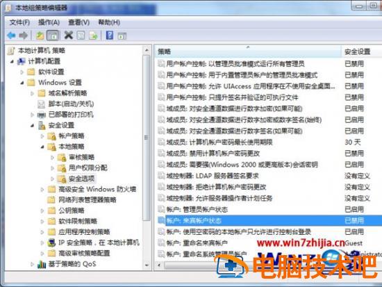 2、左侧导航栏依次点击展开计算机配置–windows设置–安全设置–本地策略–安全选项,右侧列表找到”账户:来宾账户状态“并双击;