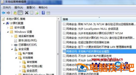 4、右侧列表中找到”网络访问:本地账户的共享和安全模式“,然后双击;