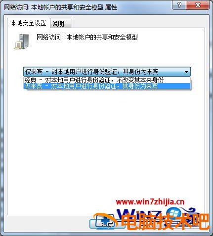5、弹出对话框中,从下拉列表中选择”仅来宾-对本地用户进行身份验证,其身份为来宾“,点击确定;关闭组策略编辑器,重启计算机即可。