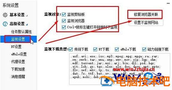 2、在左侧点击【高级设置】—【监视设置】,在右侧点击【修复浏览器关联】,点击应用并确定即可。(操作过程请关闭所有浏览器)