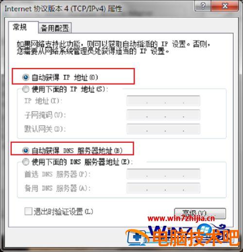 5、进去Internet协议版本4(TCP/IPv4)属性界面之后,设置为“自动获得ip地址”和“自动获得DNS服务器地址”,DNS服务器地址也可以设置为114.114.114.114尝试一下。