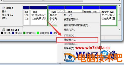 4、之后,右击选择分区,通过菜单选择“压缩卷”调整分区大小。