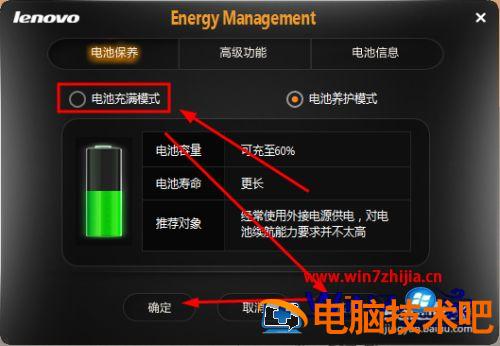 11、将电池养护模式改为电池充满模式,注意的是如果和修改后相同则不需要修改哦,依次应用–》确定按钮。