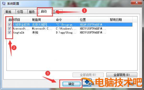 2、现在就进入到我们的系统配置中了,在顶端选项卡中选择“启动”,在“启动项目”的下方的方框中取消掉你认为不需要开机启动的软件,点击底端确定即可。
