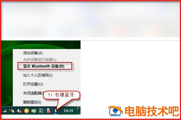 1、右键点击右下角的蓝牙图标,点击选择“显示Bluetooth设备”;