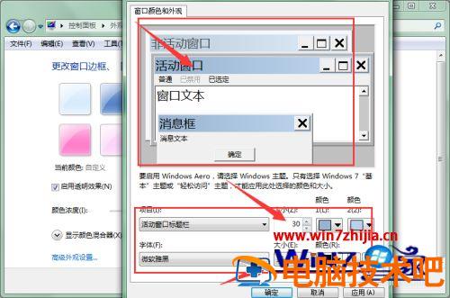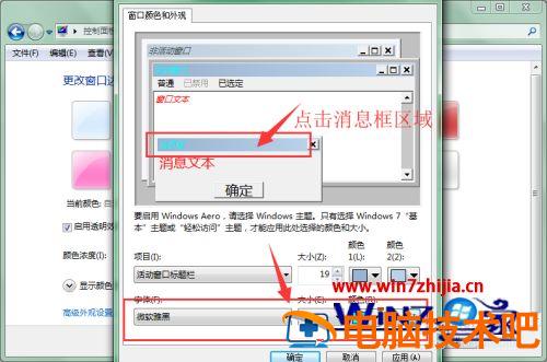 5、打开高级外观设置选项栏后,跳出窗口颜色和外观属性栏设置,在这里我们通过点击上方的消息框、活动窗口后文本区域等,然后通过下方的字体、背景颜色设置来改变形状外观。