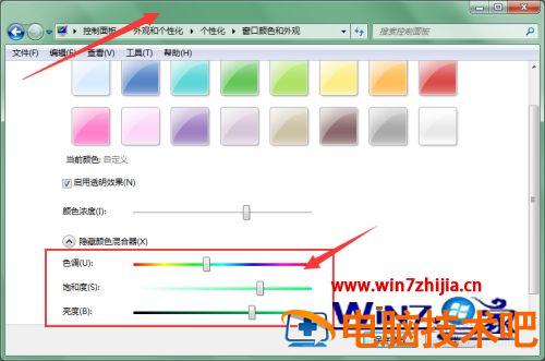 4、点击打开显示颜色混合器,可以通过调节色调、饱和度以及亮度来改变窗口颜色。