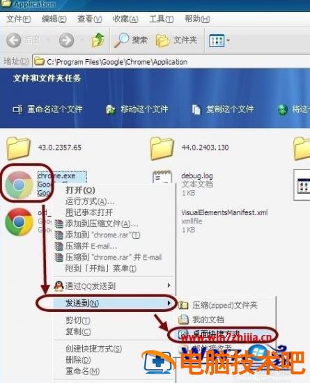2、右击chrome.exe文件,点击“发送到”,桌面快捷方式。