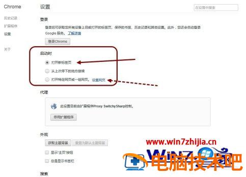 2、启动时,设置为:打开新标签页。