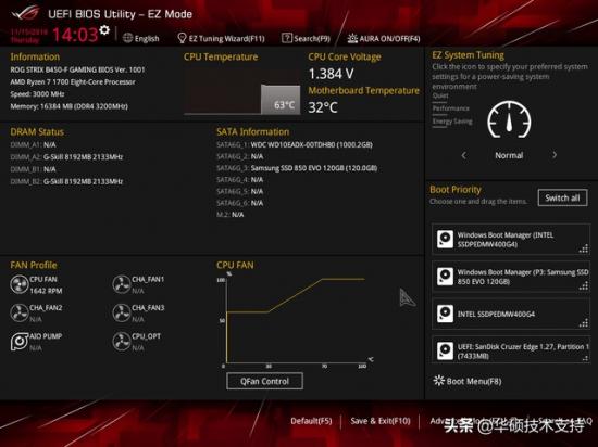 若是UEFI的STRIX或者TUF或者PRIME主板,开机进去EZ模式,我们在这里看到在这里sata在接口上,我们连接了两个硬盘。