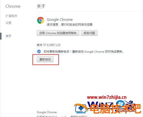 3、下载更新。如果有更新可用,请等到更新下载。然后点击重新启动按钮,完成Chrome更新的安装。