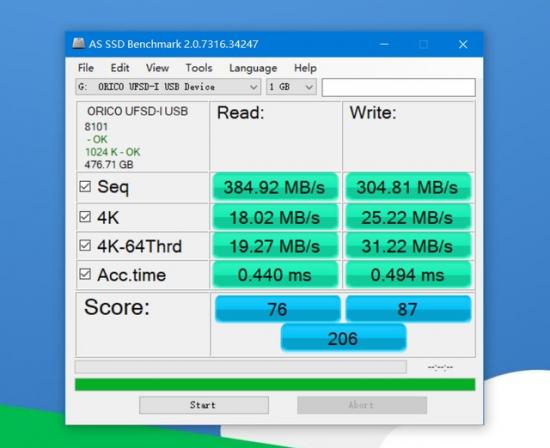 你说得对。这个结果其实是真的USB 3.我们可以在接口下看到奥瑞科的结果USFD-I快闪U盘在USB 3.1也能取得好成绩,读取速度384.92MB/s,写入速度为304.81MB/s。