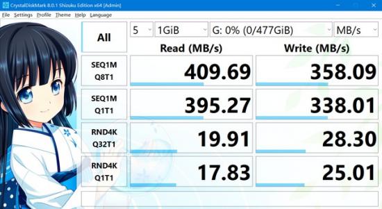 这个数据是可以接受的,当然不是它的极限,因为我现在用它USB 3.1接口主机测试,配置如图所示。官网称在USB 3.2 Gen在11模式下取可达411MB/s,写入速度可达353MB/s,但从我个人的主机运行分数来看,虽然还没有达到极限,但这个速度已经能够满足我的日常使用需求。