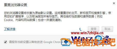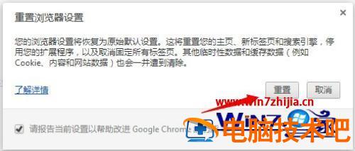 4、此时会提示您如果把济览器重置,您的主页、新标签页和搜索引擎,停用您的扩展程序,以及取消固定所有标签页。其他临时性数据和缓存数据(例如 Cookie、内容和网站数据)也会一并遭到清除。点击【重置】。