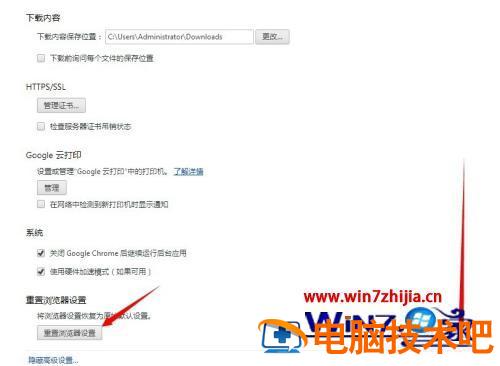 3、Google Chrome浏览器重置设置的地方藏的比较深,需要拉到最下面才可以看到【重置浏览器设置】点击此处。