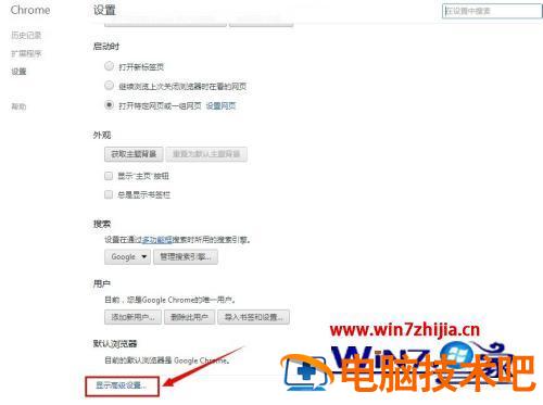 2、进入Google Chrome浏览器设置界面以后,要往下拉,拉到低再点击【显示高级设置】。