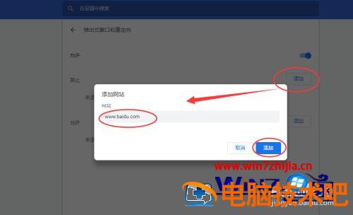 7、比如我们想把百度的网站给禁止弹窗,就可以按照图中的方法,点击【添加】,然后输入百度的网址,点击添加即可。当然添加后也可以修改或取消。