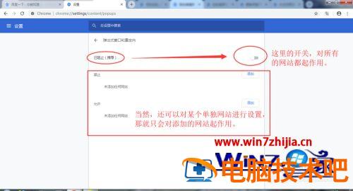 6、打开后如图所示,图中叙述很详细了,切换开关,即可进行设置浏览器对所有的网站都禁止/显示弹窗。如果相对某个具体的网站进行设置,那就点击【添加】按钮,添加网站地址即可。