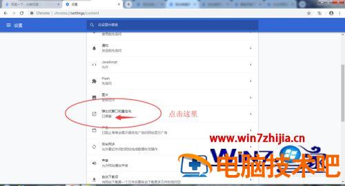 5、打开内容设置以后,在选项里面找到【弹出式窗口和重定向】选项,点击打开它。