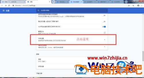 4、打开高级设置后,在众多的设置选项中找到【内容设置】,点击打开内容设置选项。