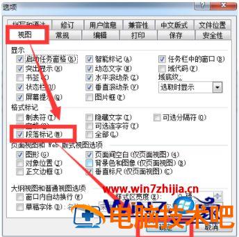2、”选项“界面打开之后,点击”视图“,接着在”格式标记“一栏内容下,点击去掉”段落标记“前面的勾,点击”确定“;