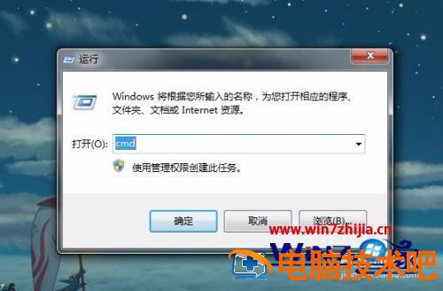 5、然后在运行窗口中输入cmd指令,点击确定打开系统命令执行程序。