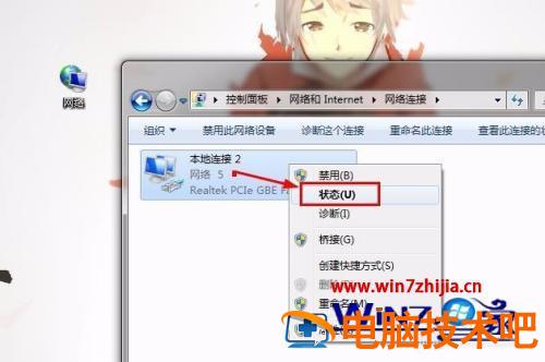 2、然后点击网络和共享中心左侧的更改适配器设置,就可以直接进入网络连接页面,在网络连接页面中可以看到目前电脑使用的本地连接,右键本地连接查看状态。