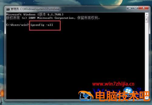 6、接下来在打开的系统命令执行程序窗口中,输入或者复制黏贴ipconfig -all这个查询命令到命令执行程序窗口中,然后按键盘回车键执行命令。