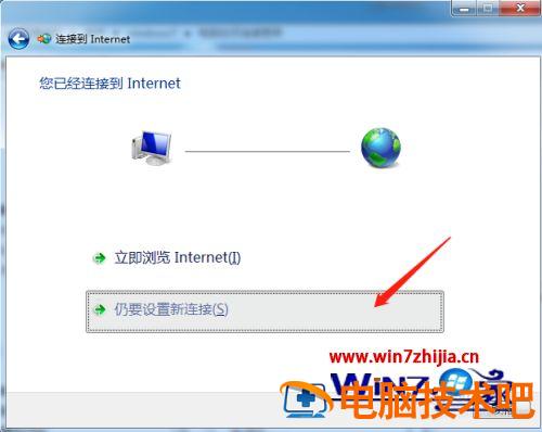 5、点击【下一步】,弹出【连接到internet】窗口,如果你已经连接一个网络,那么选择第二项【仍然设置新连接】按钮单击。