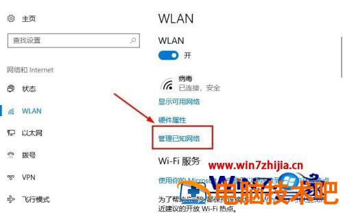 4、在WLAN选项右侧,点击“管理已知网络”。