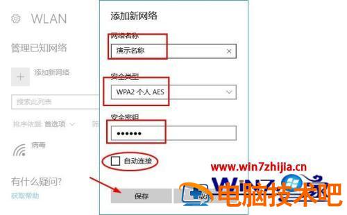 6、然后会弹出一个窗口,在“网络名称”栏填写隐藏的wifi名称,选择“安全类型”加密方式,填写密码,点击“保存”即可。