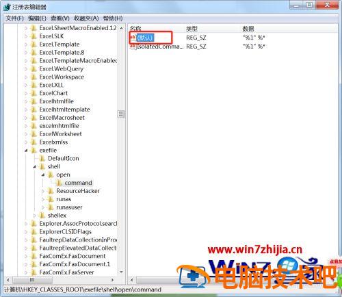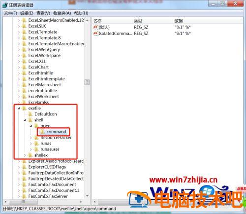 3、进入“注册表编辑器”页面,按序点击打开:HKEY_CLASSES_ROOT\exefile\shell\open\command。