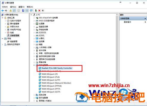 第二步、进去设备管理器之后,点击网络适配器,查看网卡驱动“Realtek PCle GBE Family Controller”是否有黄色感叹号和是否被禁用,如下图所示: