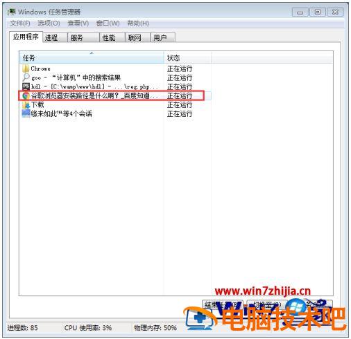 1、首先打开谷歌浏览器,让它运行。打开Windows任务栏管理器,看到谷歌浏览器显示正在运行。右击它,选择“转到进程”。