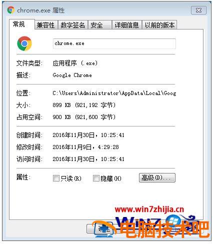 2、谷歌的进程会加深颜色显示的,右击它,选择“属性”。查看谷歌的属性,看属性中的位置。