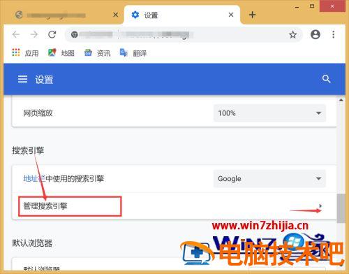 3、在设置里面滑动鼠标,在下面找到搜索引擎,并在搜索引擎的子菜单中找到管理搜索引擎点击进入;