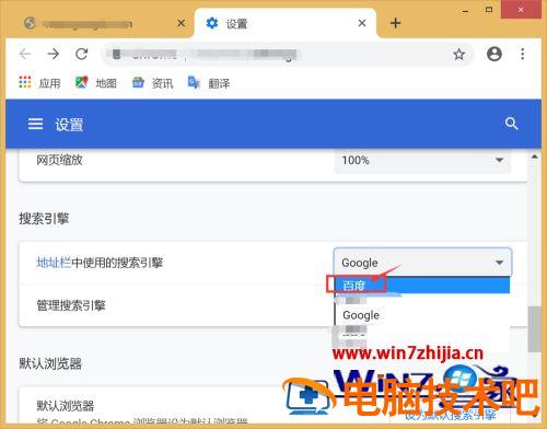 6、还有一种简单的方法就是在搜索引擎里面找到第一个地址栏中使用的搜索引擎点击后面的三角板符号,在罗列出来的选项中选择百度就可以了,返回到主页刷新一遍在重新进入网页就可以了。