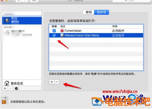 3、可以看到有两个应用程序是默认开机启动的,点击左下角的“+-”即可添加或删除开机启动程序。如果机器有设置密码,先点击左下角锁的图标进行解锁。