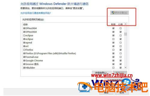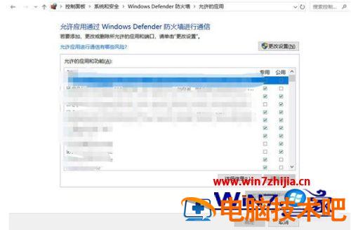 5、点击允许应用或功能通过windows defender 防火墙,点击更改设置。