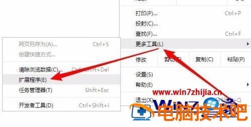 3、接下来在打开的下拉菜单中, 我们依次点击“更多工具/扩展程序”菜单项。