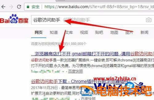 1、首先在浏览器中打开百度搜索,在搜索框中输入“谷歌访问助手”进行搜索,然后点击搜索结果中的快捷链接,把安装文件下载到本地以备用。