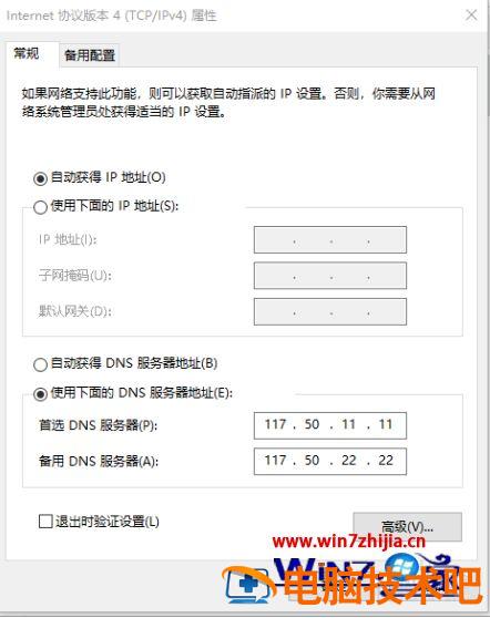 4、在下方使用下面的DNS地址中填入首选117.50.11.11备用117.50.22.22后确定即可。