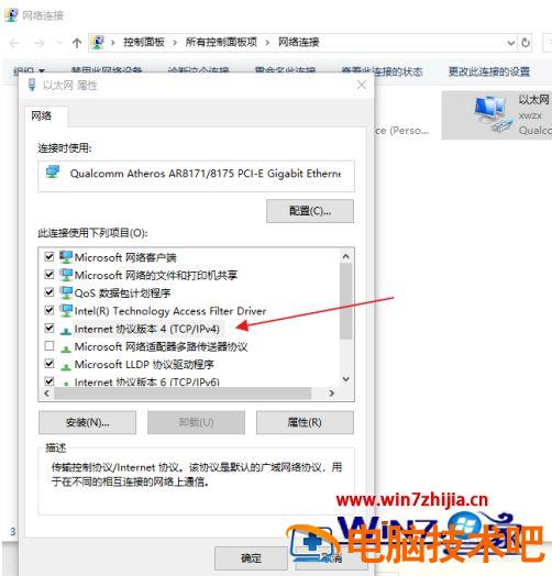 3、右键点击当前接入网络的网卡属性。双击打开Internet协议版本4(TCP/IPv4)。