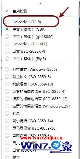 4、这时会弹出一个网页编码的菜单。里面含有多种网页语言编码。我们点击选择Unicode(UTF-8)。