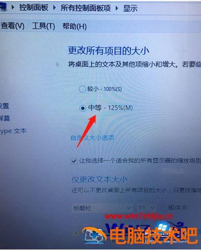 5、更改字体大小后,选择更改所有项目的大小,然后选择中等或者自定义大小的选项抖可以,根据自己的需要要定吧。