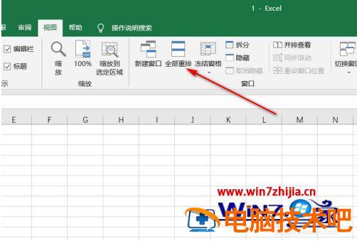 4、然后点击文档1上方的【视图】按钮,再点击里面的【全部重排】按钮。