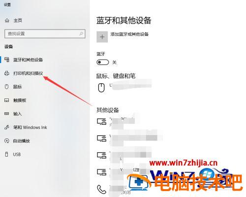 3、默认打开蓝牙设置页面,点击左侧的打印机和扫描仪选项。