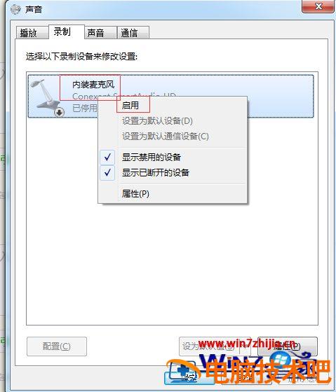 4、然后右击【录制】下的【内装麦克风】选择【启用】。